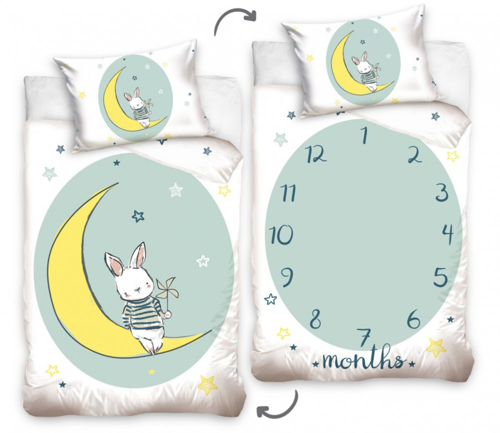 Nyuszi holdacskával és órával ágyneműhuzat, kétoldalas (100x135 + 40x60 cm)